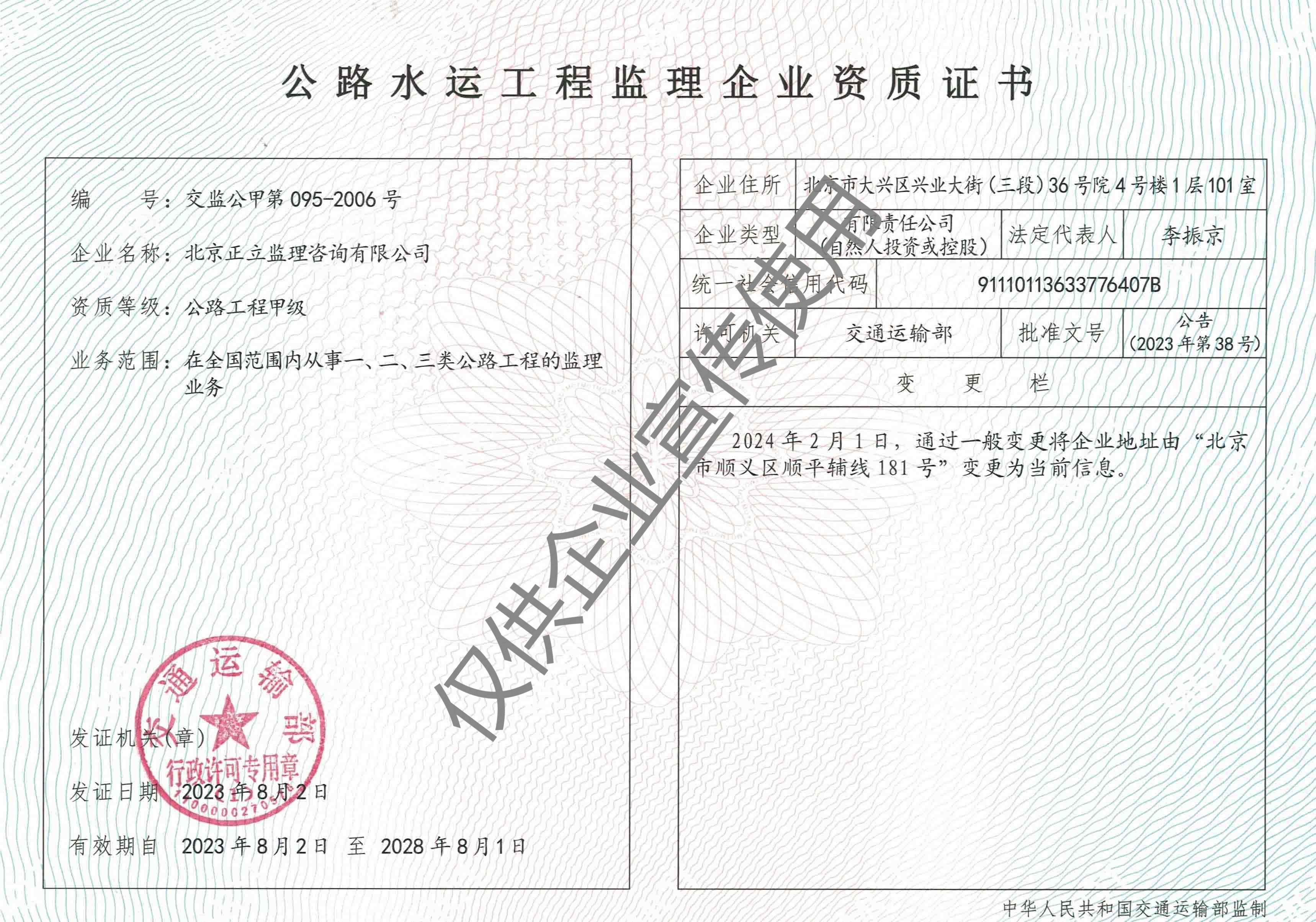 公司現(xiàn)為中國交通建設監(jiān)理協(xié)會理事單位,持有交通運輸部公路工程甲級資質(zhì)、房屋建筑工程乙級資質(zhì)、市政公用工程乙級資質(zhì)、綜合檢測乙級資質(zhì)。能夠承擔高等級公路、大型橋梁、隧道工程、房建市政的施工監(jiān)理及技術咨詢服務。